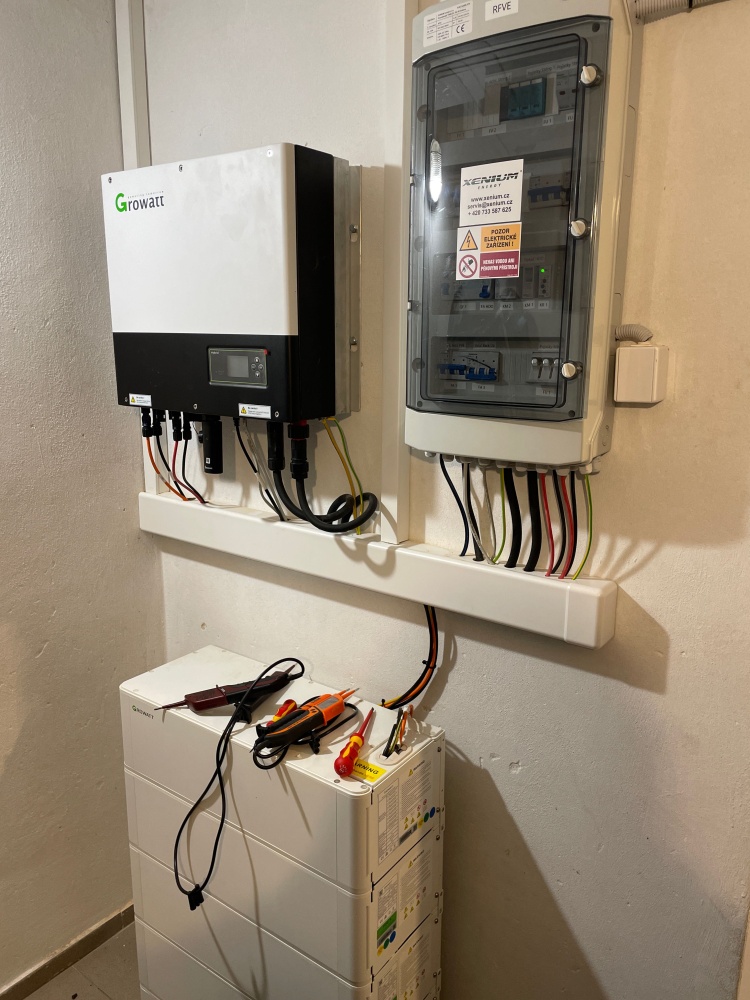 • Výkon FVE 5,46 kWp, baterie 7,68 kWh, střídač GROWATT SPH8000TL3, FV panely -12 ks Ja SOLAR 455 Wp, optimizéry TIGO, Growatt Groboost – přetoky do vody