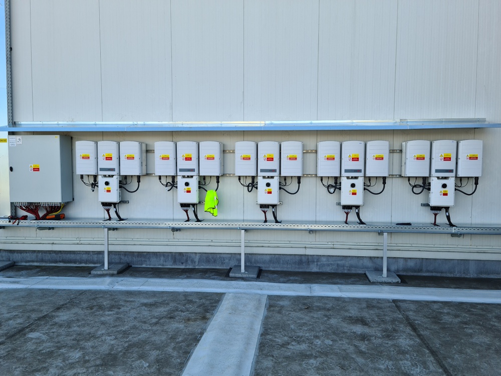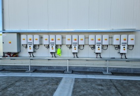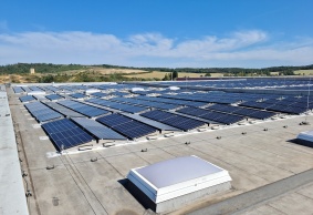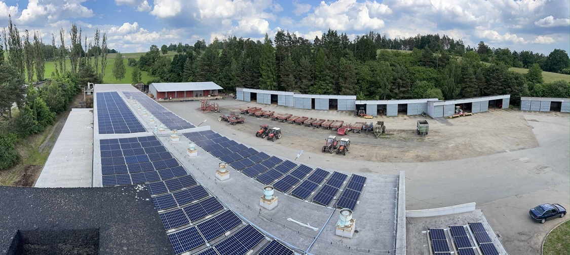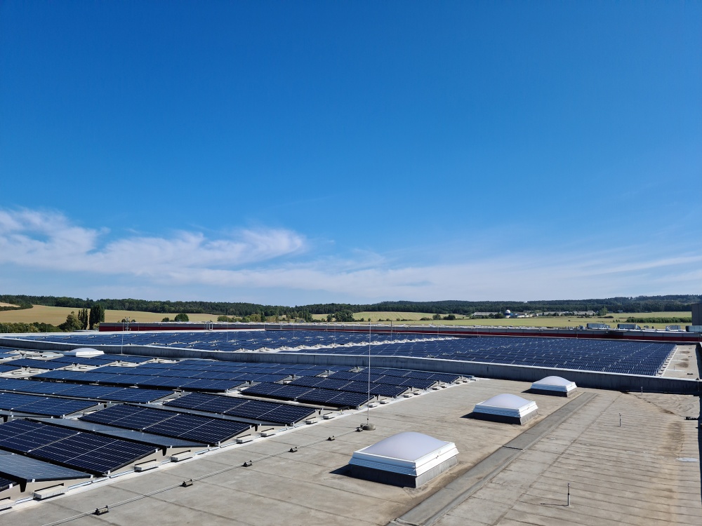 • Fotovoltaická elektrána o celkovém výkonu 546 kWp je instalována na střeše centrálního skladu provozovatele obchodního řetězce. Panely jsou instalovány na samozátěžové konstrukci s orientací východ - západ.