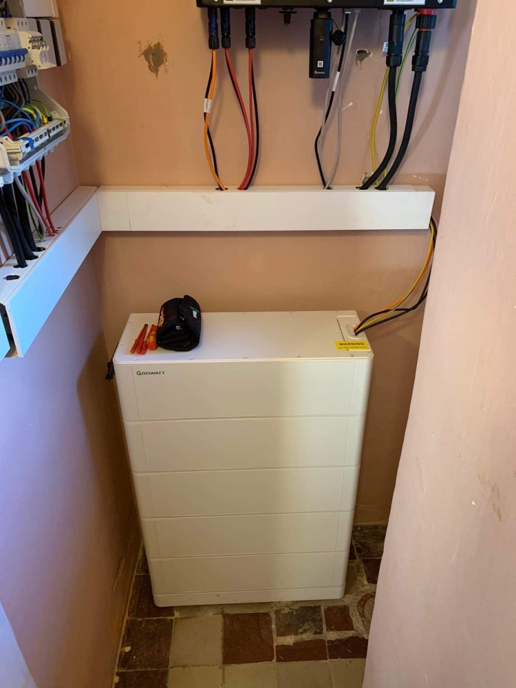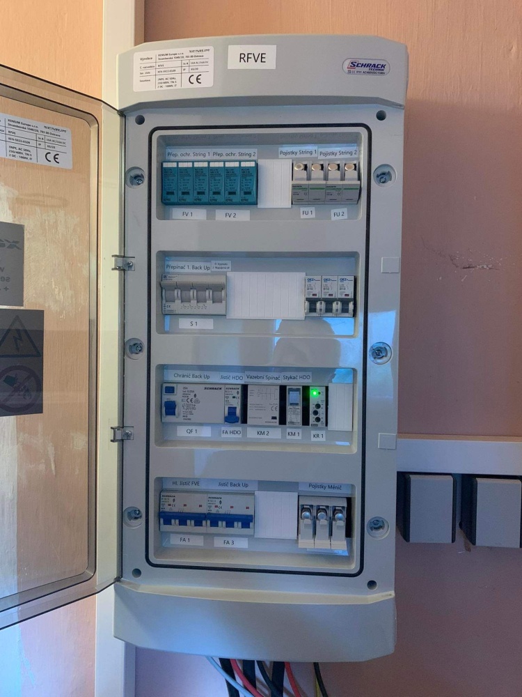 Výkon FVE 9,56 kWp, baterie 10,24 kWh, střídač GROWATT SPH10000TL3, FV panely -21 ks Ja SOLAR 455 Wp, optimizéry TIGO, Growatt Groboost – přetoky do vody