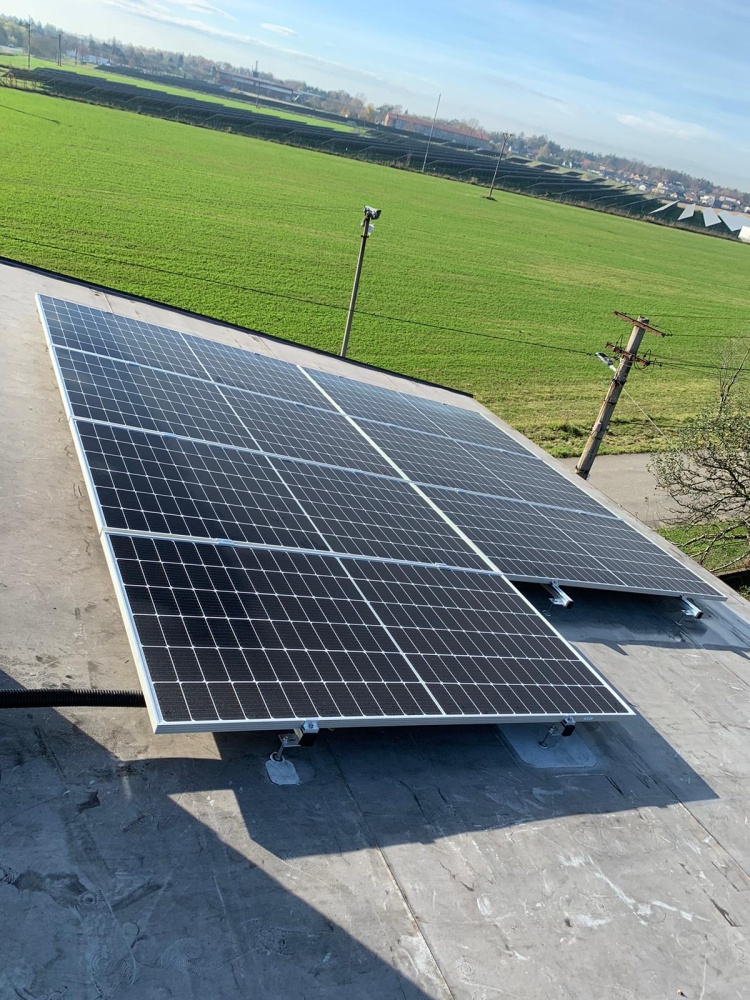 Zde instalace FVE na mírnou sedlovou střechou s PVC krytinou – důraz kladen na perfektní utěsnění kotevních bodů