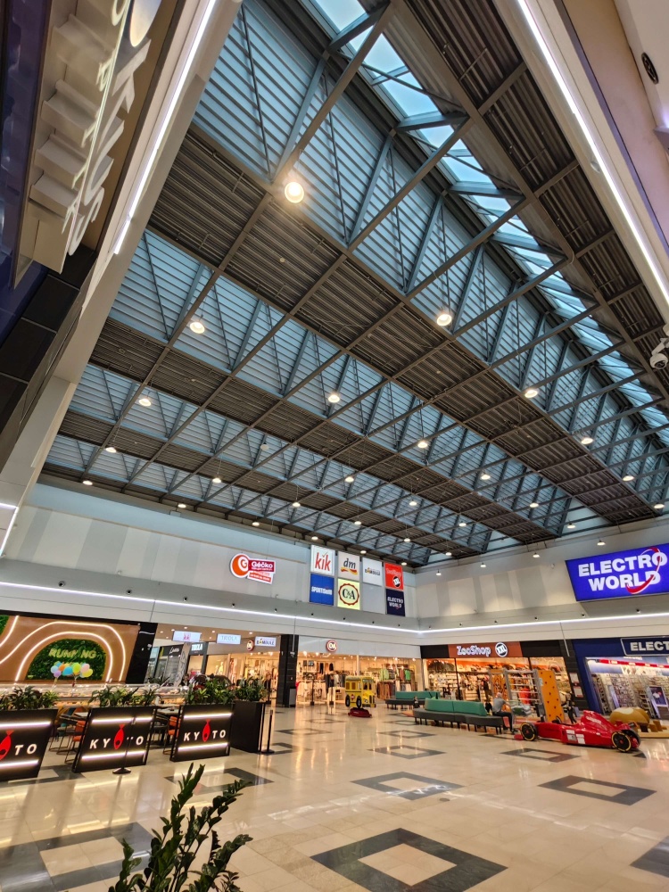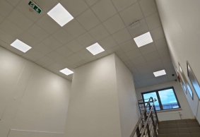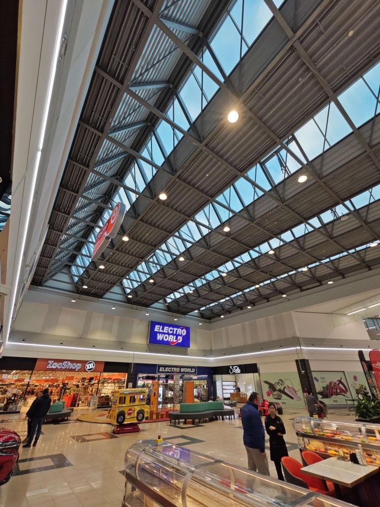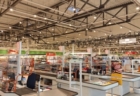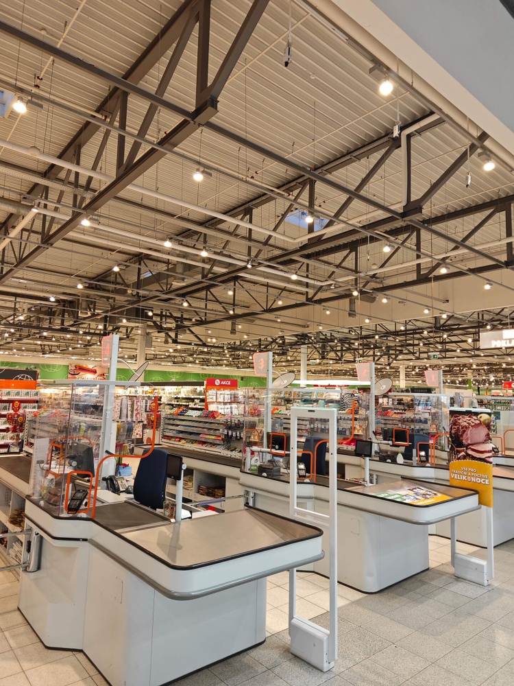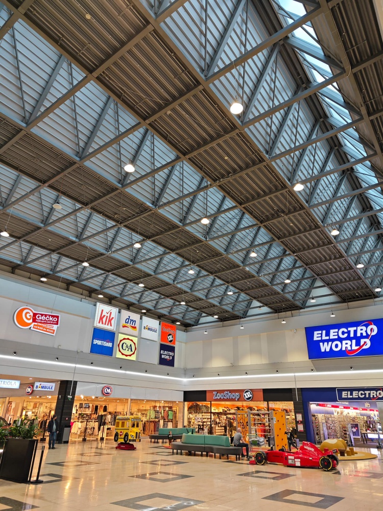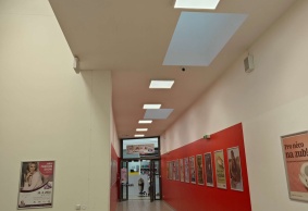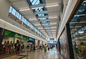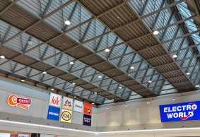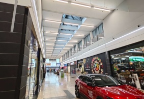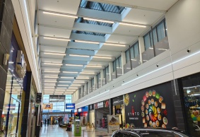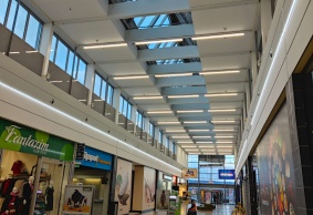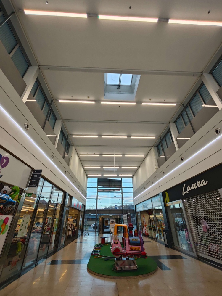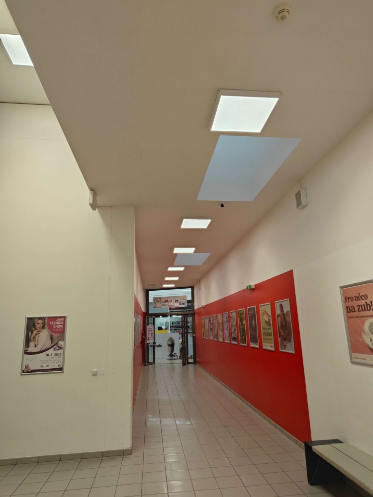 Místo instalace - zázemí a pasáž nákupního centra. Použité osvětlení - LINEAR E120 30W-840, ORBIT 31 120W-840-60D, BUBU 32 100W-740-BAT, FLAT 0606 36W-840-120D, FLAT E 1203 36W-840-120D
