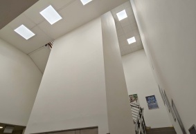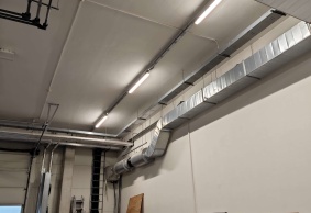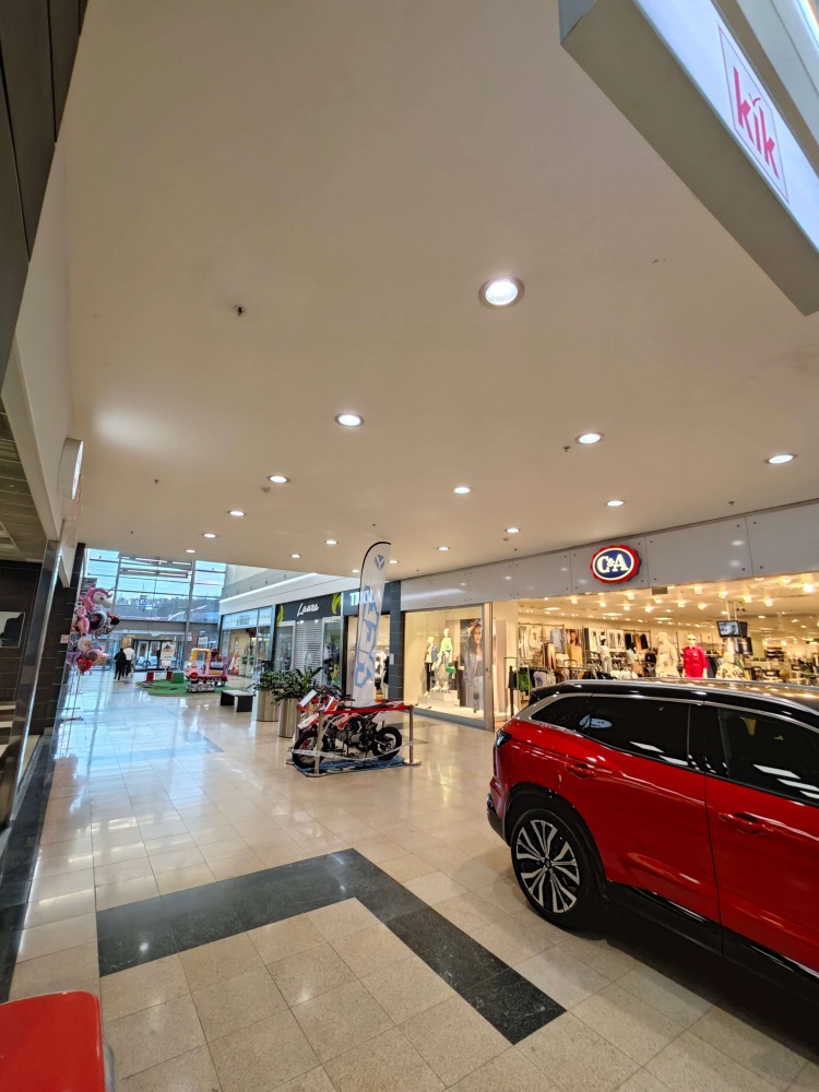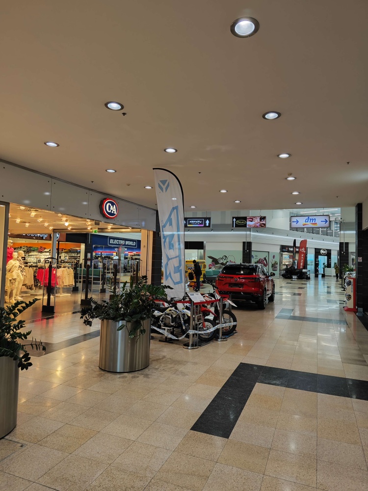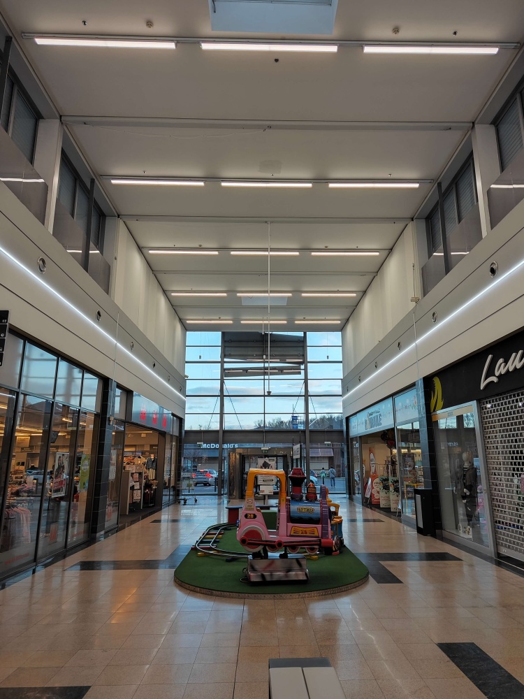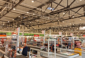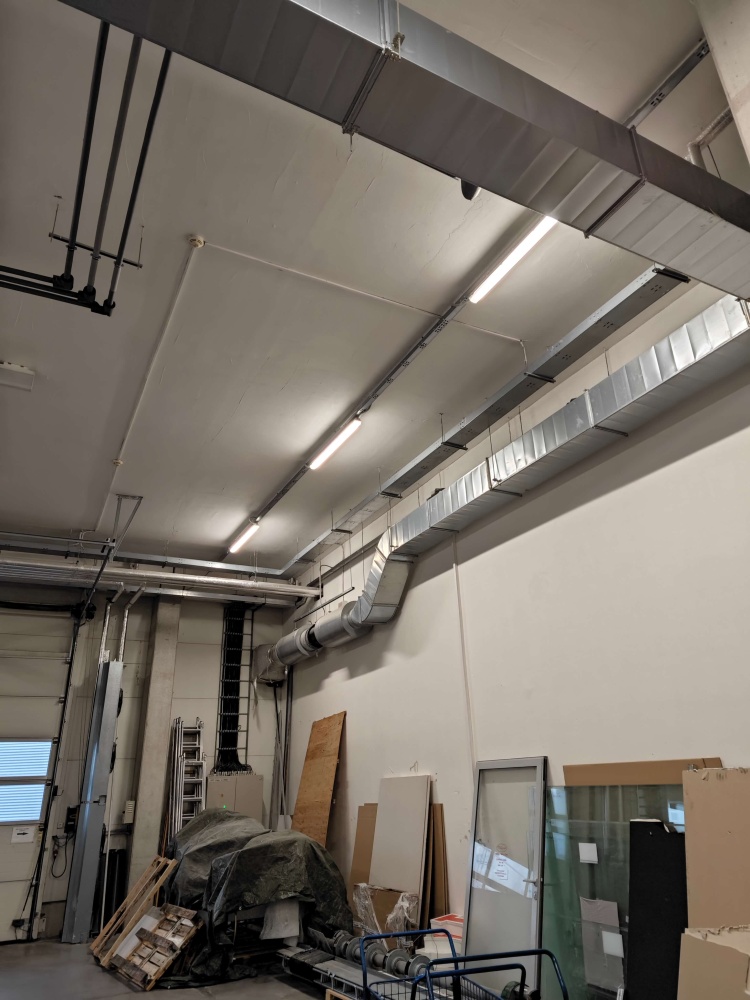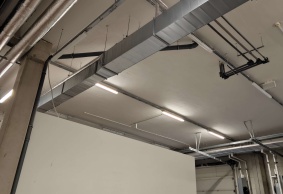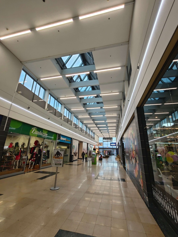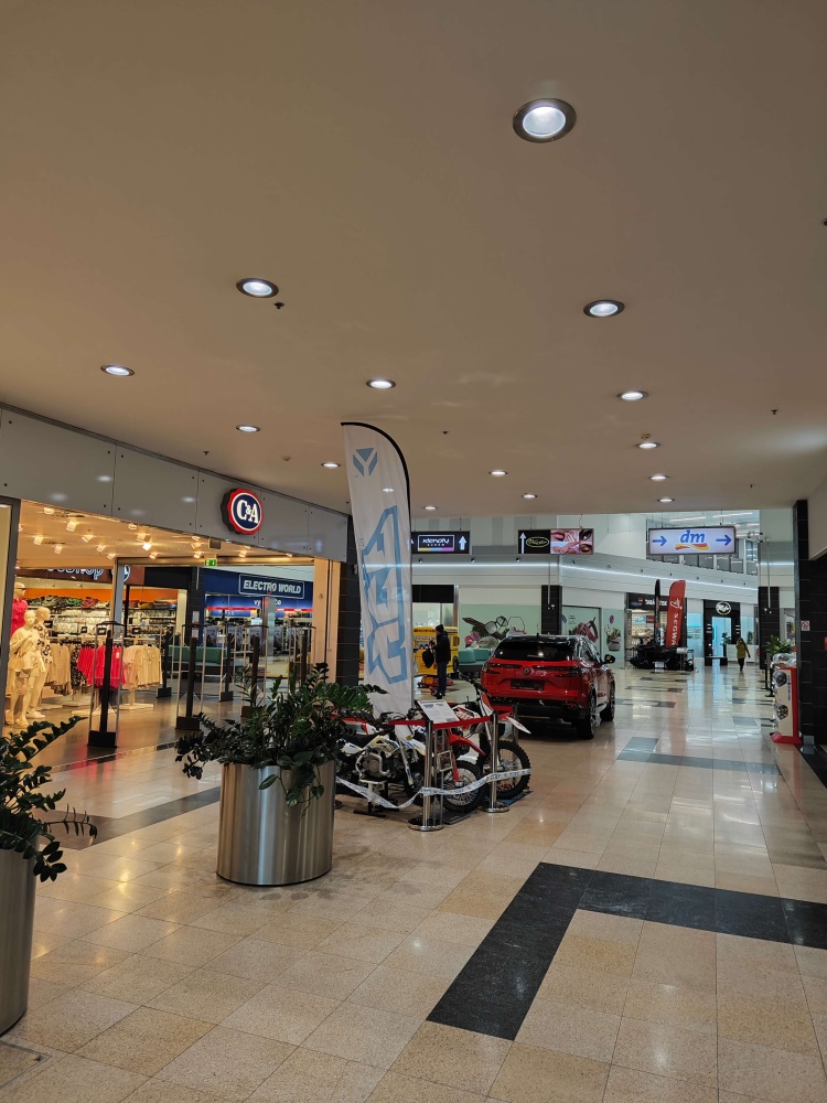 Místo instalace - zázemí a pasáž nákupního centra. Použité osvětlení - LINEAR E120 30W-840, ORBIT 31 120W-840-60D, BUBU 32 100W-740-BAT, FLAT 0606 36W-840-120D, FLAT E 1203 36W-840-120D