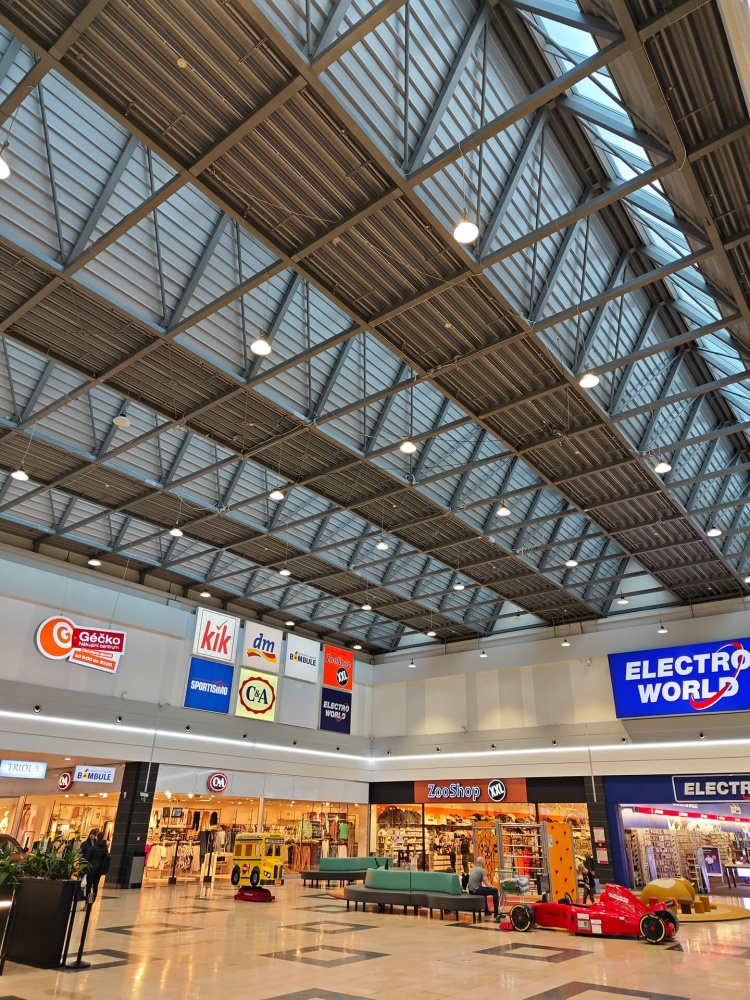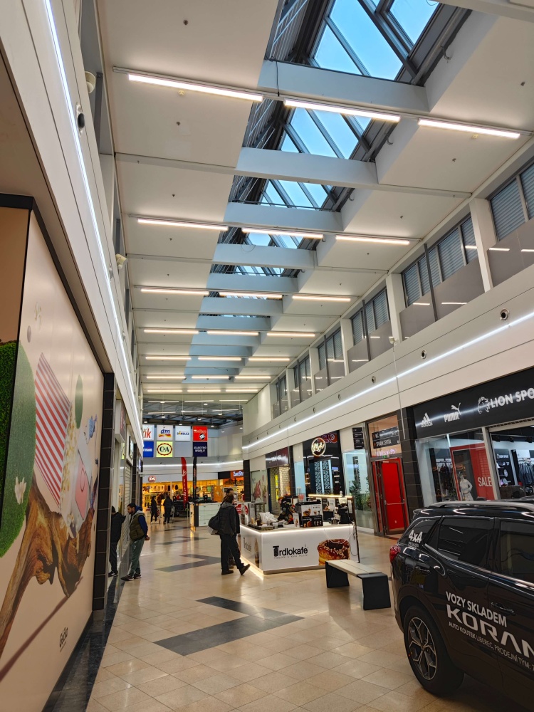 Požadavkem investora byla jednoznačná úspora nákladů na osvětlení nákupního centra v pasážích a zázemí. Byl vytvořen projekt osvětlení včetně světelně technických výpočtů. Na základě toho proběhla kompletní výměna starého osětlení za nové moderní led úsporné osvětlení. Součástí toho bylo také nahrazení venkovního osvětlení a to pomocí úsporného led osvětlení BUBU.