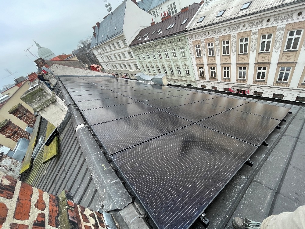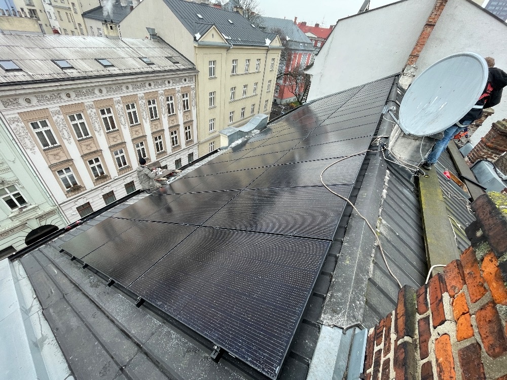 Zákazník přišel k nám s požadavkem snížit spotřebu na svém bytovém domě, primárně řešeno pro pivovárek který je součastí nemovitosti. Instalace proběhla na chráněnou budovu Památkového Ústavu, kotvení konstrukce se provedlo na šikmou střechu kde byla podmínka kompletní provedení v černé barvě jak panely tak konstrukce. Pod panely jsou instalovány optimizéry pro optimální výkon FVE.