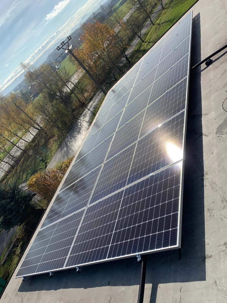 Zde instalace FVE na mírnou sedlovou střechou s PVC krytinou – důraz kladen na perfektní utěsnění kotevních bodů