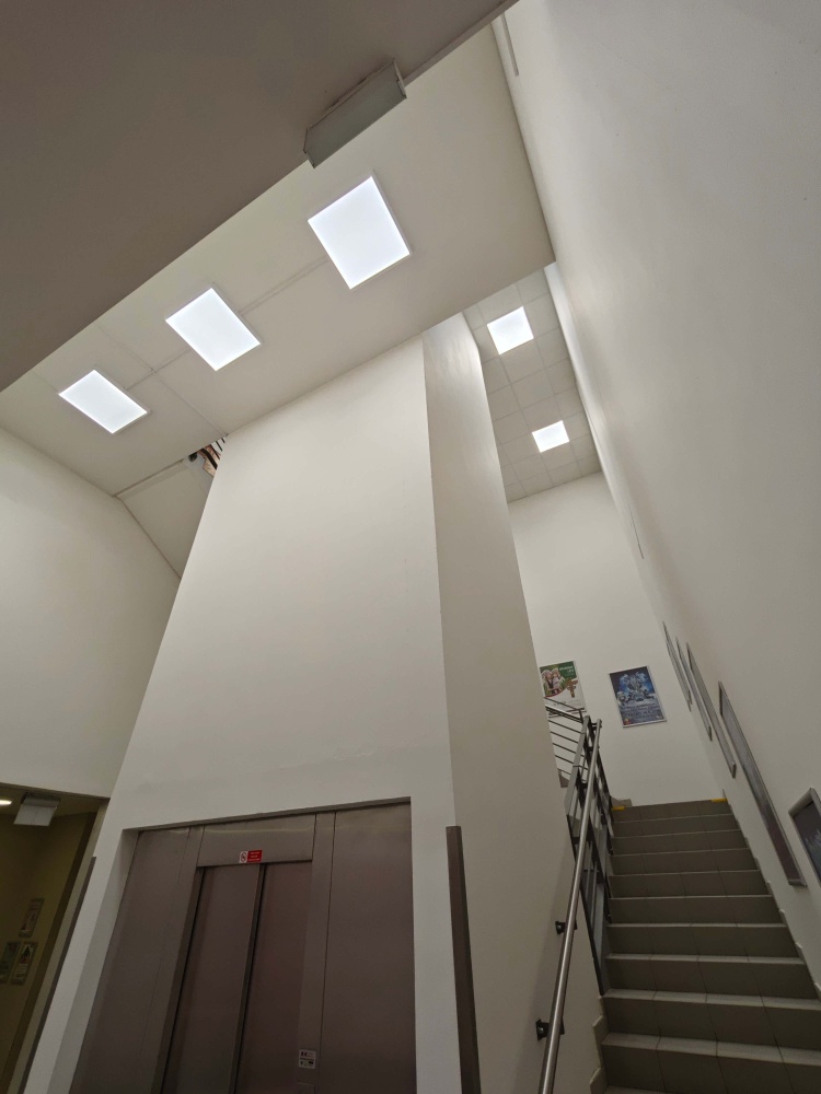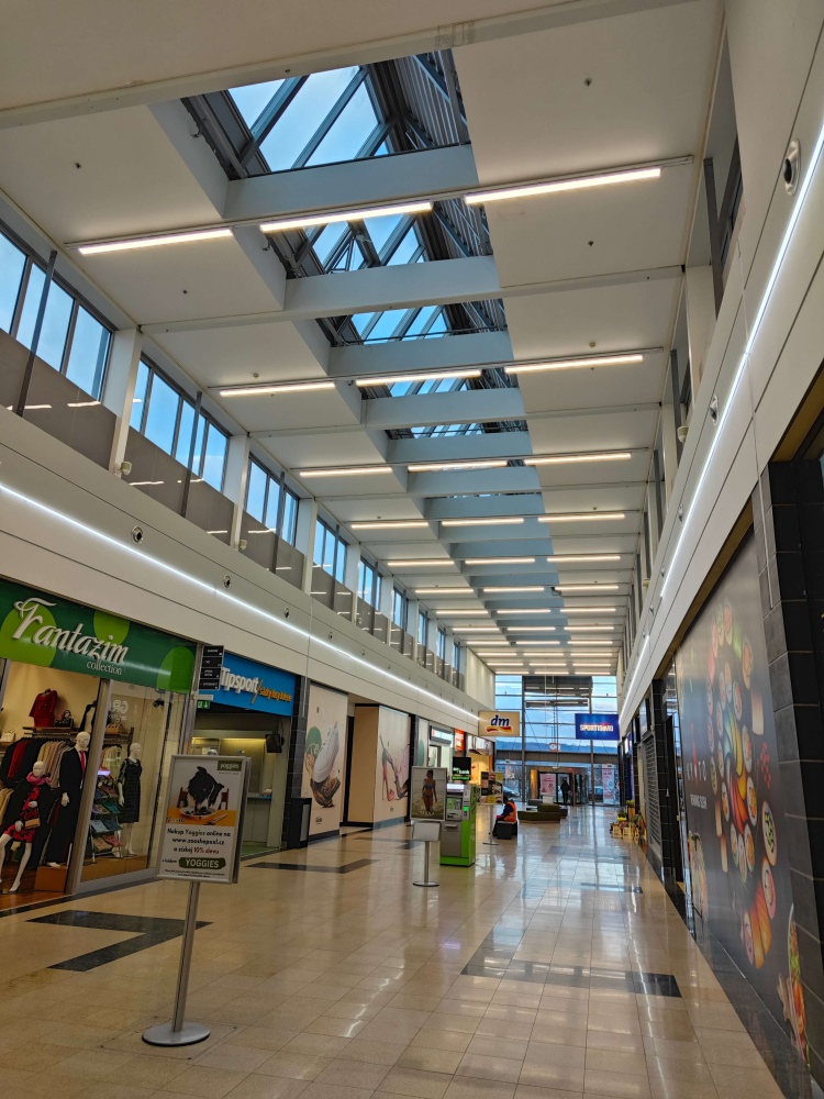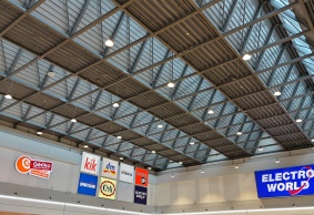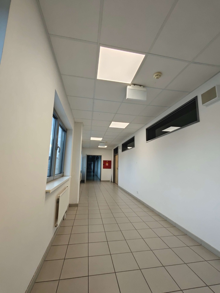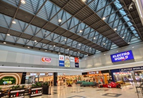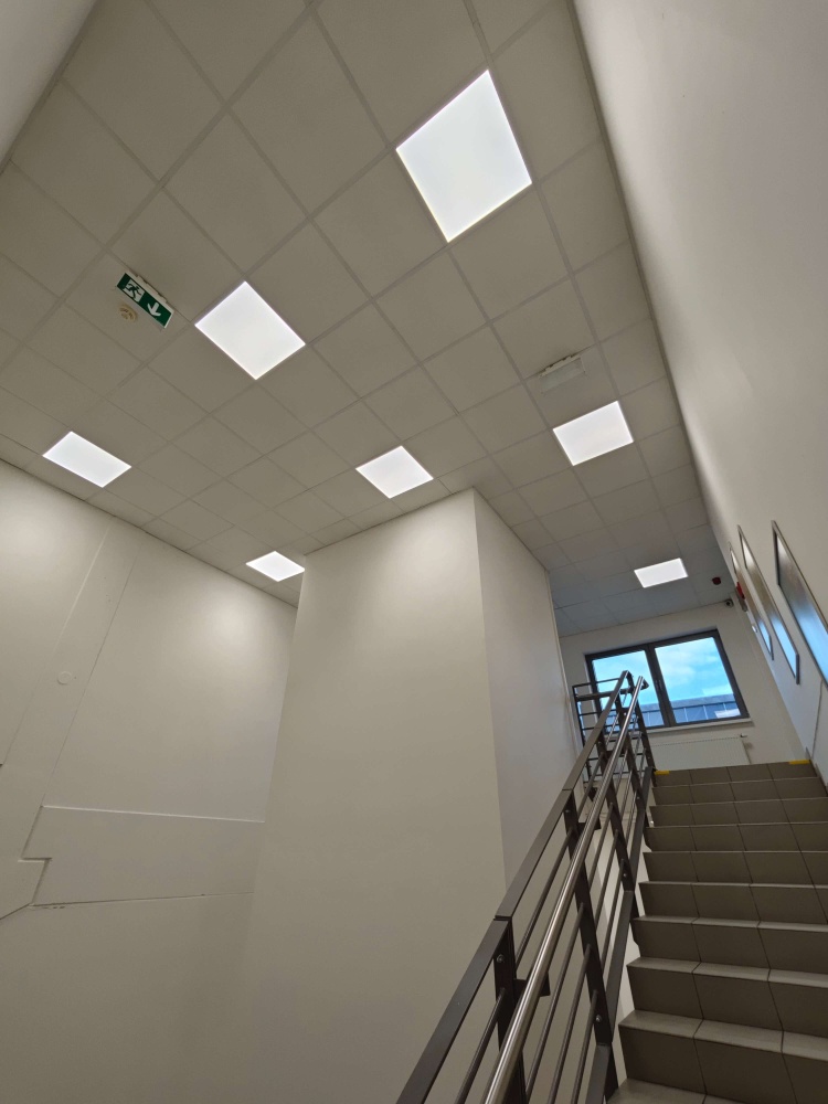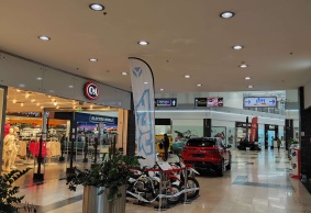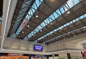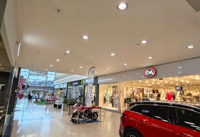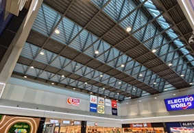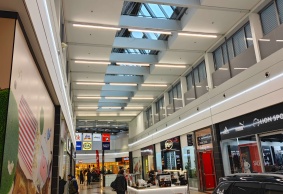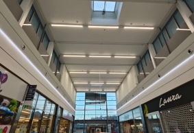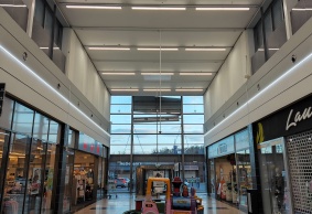 Místo instalace - zázemí a pasáž nákupního centra. Použité osvětlení - LINEAR E120 30W-840, ORBIT 31 120W-840-60D, BUBU 32 100W-740-BAT, FLAT 0606 36W-840-120D, FLAT E 1203 36W-840-120D