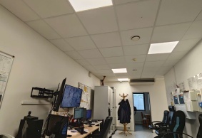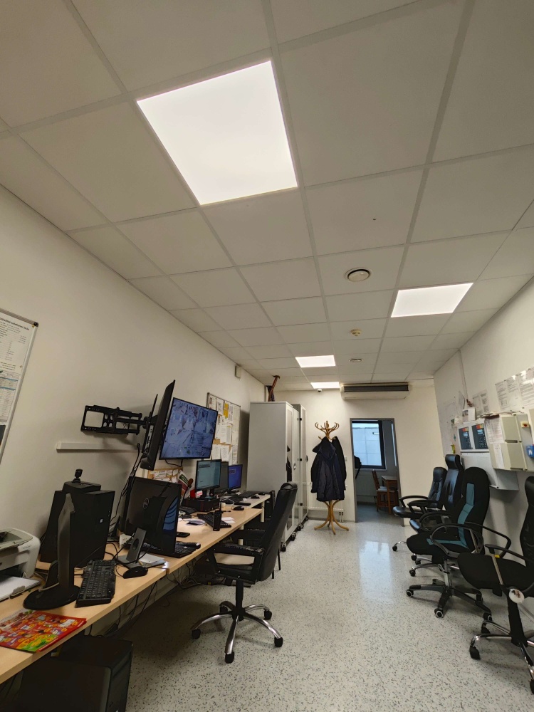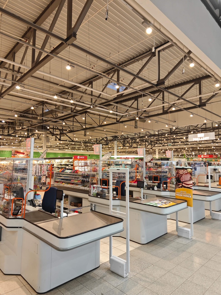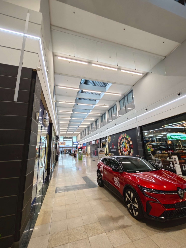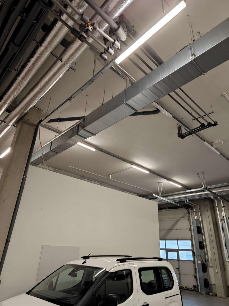 Místo instalace - zázemí a pasáž nákupního centra. Použité osvětlení - LINEAR E120 30W-840, ORBIT 31 120W-840-60D, BUBU 32 100W-740-BAT, FLAT 0606 36W-840-120D, FLAT E 1203 36W-840-120D