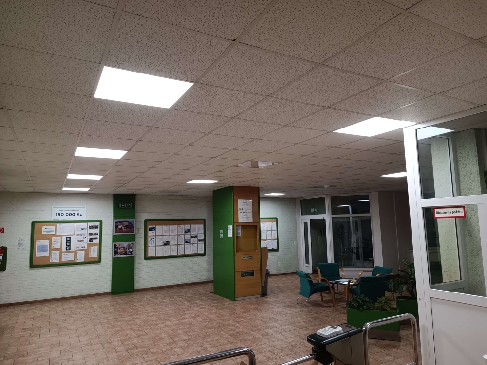 • Na zakladě výběrového řízení investora byla realizována výměna hlavního osvětlení I. až X. haly. Došlo k výměně starých výbojkových svítidel za nové moderní led osvětlení, doplněné také o nouzové led osvětlení.